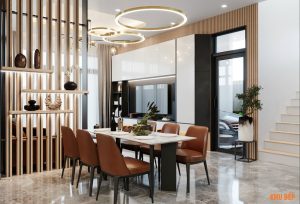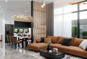 Với mặt tiền kiến trúc hiện đại, kiến trúc sư đã tinh tế và khéo léo khi xử lý hệ thống kiến trúc và phối cảnh để từ đó có thể tạo nên những ý tưởng thiết kế đột phá và mới mẻ cho công trình kiến trúc. Không gian sân trước thiết kế khá rộng và thoáng, hệ thống bậc tam cấp thiết kế rộng và thoáng, thiết kế cao cùng với việc ốp đá tự nhiên màu nâu xám, cùng với hệ thống trụ cột vuông với những đường gờ chỉ chạy dọc thân tường, màu sơn vàng đậm, giúp lôi cuốn và thu hút hơn rất nhiều.