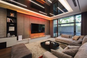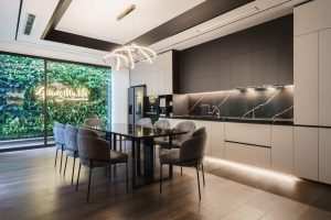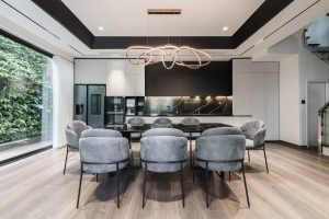 Nếu kiến trúc bên ngoài được ví như bản hòa ca trong trẻo của cây xanh, gió và nước thì nội thất bên trong lại chính là “bàn tiệc” của nghệ thuật và cảm xúc thể hiện chất riêng của gia chủ. Đó là sự cộng hưởng tuyệt vời của những đường nét thẳng đầy dứt khoát cùng tone gỗ sáng và cách sắp đặt ánh sáng độc đáo.