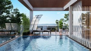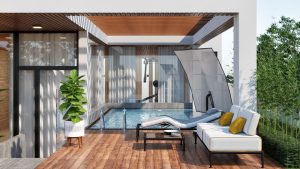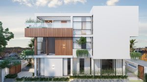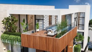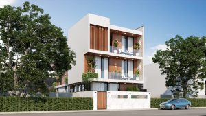 Thiết kế kiến trúc biệt thự mini với mặt tiền rộng, hình khối kiến trúc của mẫu biệt thự theo phong cách tự do. Hai mặt tiền, không gian căn hộ đã thoáng càng thêm thoáng rộng và tiện nghi với ban công kính cường lực.