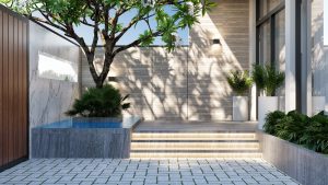 Hệ thống tường rảo cổng trước thiết kế ốp đá tự nhiên màu xám trắng, cùng với hệ thống cửa gỗ và khung sắt, tạo nên một hiệu ứng mới và nhất quán. Chính điều này đem lại sức sống thẩm mĩ mạnh mẽ cho không gian nội thất của căn biệt thự.