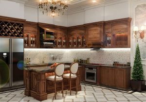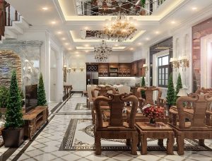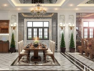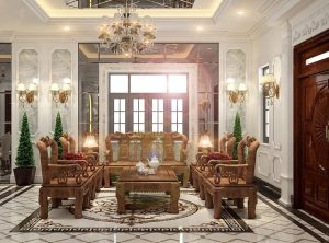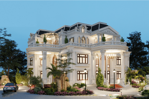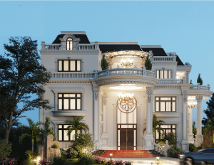 Lấy ý tưởng thiết kế của kiến trúc Châu Âu hiện đại và sang trọng, ý tưởng triển khai thiết kế nhà tuân thủ nghiêm ngặt những nguyên tắc đối xứng và cân đối. Tỷ lệ mảng khối được bố trí cân đối từng mảng nhỏ, từ thiết kế mặt tiền với bậc tam cấp thiết kế cao thoáng, điểm tô bằng gạch màu đỏ nhung, kế hợp hai phía màu nâu đen. Lan can hao bên bậc tam cấp được xây dựng khá đẹp mắt. Hệ thống trụ cột tròn Ionic cùng với khối tròn ở phần đại sảnh củng với đèn trùm lớn chiếu sáng, giúp cho công trình càng được điểm tô thêm những nét sang trọng và tinh tế.
