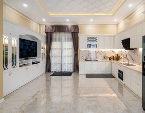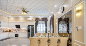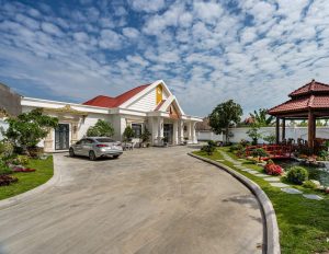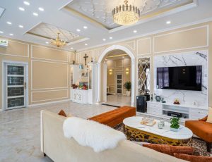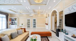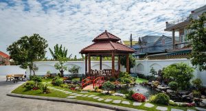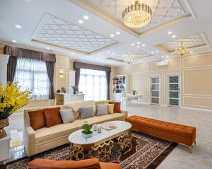 Căn biệt thự mái thái được thiết kế theo phong cách Neo Classic xung quanh là cảnh sắc tươi đẹp của cỏ cây, hoa lá. Bước vào không gian ấy, chúng ta như lạc vào một thế giới khác, thanh bình, tĩnh lặng, khác hẳn với sự xô bồ, đông đúc của chốn thị thành. Nội thất được trang trí sang trọng tinh tế.