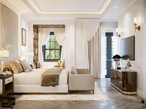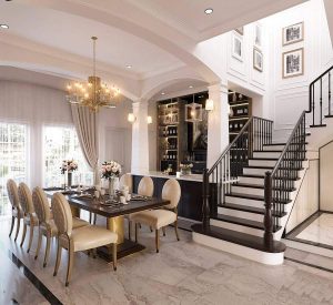 Với mong muốn mang âm hưởng châu âu hài hoà gần gũi với cuộc sống hàng ngày nhưng vẫn phải đảm bảo độ sang trọng vốn có của phong cách. ℎ đã cùng với gia chủ lựa chọn từng món đồ, từng tông màu chủ đạo tô vẽ lên 1 bản vẽ gần như hoàn hảo trong từng không gian.