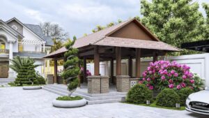 Không gian xung quanh nhà được thiết kế nhiều cây xanh, mát mẻ, gần gũi thiên nhiên. Thiết kế khuôn viên nhà thoáng đãng, lưu thông khí qua những hệ thống cửa, ban công tạo nên không gian vô cùng đáng sống.