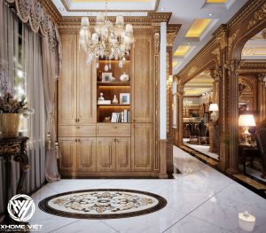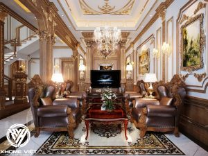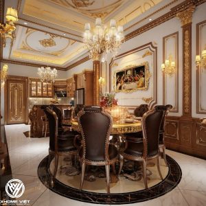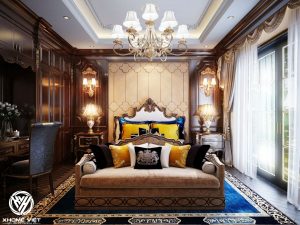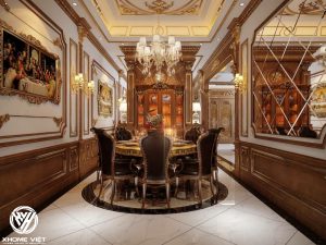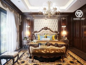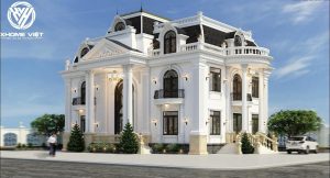 Sử dụng ngôn ngữ thiết kế tân cổ điển, với hệ cột trụ cùng hoa văn phào chỉ tinh tế, căn biệt thự mang đến những trải nghiệm sống khó quên dành cho gia chủ. Hình khối không gian của căn nhà được thiết kế đối xứng với những tỷ lệ vàng. Hệ thống trụ cột ionic kết hợp với khối ban công hình vòm, lan can sắt nghệ thuật phun sơn tĩnh điện đen, cùng với hệ thống sơn màu sáng trung tính, đem đến những nét đẹp đồng bộ cho ngôi biệt thự sang trọng này.