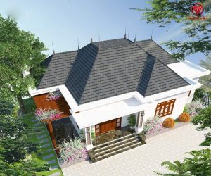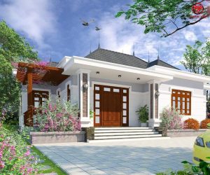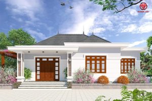 Phần mái thái nổi bật góp phần tạo sự ấn tượng cho mẫu thiết kế này. Kết hợp sơn tường trắng trung tính cùng những mảng màu xám ghi vừa đối lập lại vừa làm nổi bật lẫn nhau. Hệ cửa chính sử dụng gỗ hai cánh to màu đỏ như đồng điệu với màu sắc của ngôi nhà. Các chật liệu cao cấp được chú trọng sử dụng để nâng cao chất lượng công trình