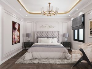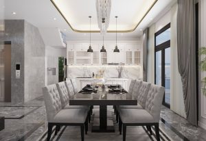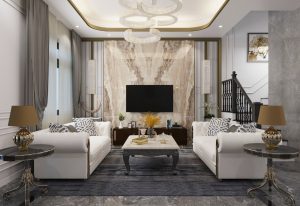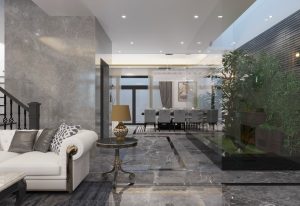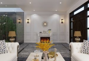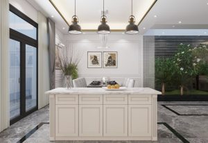 Mẫu nhà phố hiện đại pha chút nét tân cổ nhẹ nhàng tạo nên vẻ đẹp hài hòa thu hút khó tả. Phối màu toàn ngôi nhà từ ngoài vào trong theo hướng màu sáng của sơn trắng và màu vàng sữa sang trọng của đá hoa cương từ ngoài mặt tiền tầng 1 đến nội thất trong nhà, mọi thứ như hòa lại tạo nên cản giác nhẹ nhàng, thoải mái và yên bình.