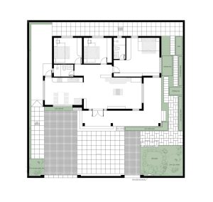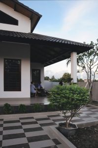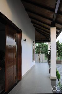 Thiết kế nhà 1 tầng mái thái nổi bật với hàng hiên rộng chữ L bao quanh nhà ở hướng Đông Nam, hàng hiên rộng vừa là nơi tiếp khách cho chủ nhà vừa ngăn cản những tác động xấu của thời tiết vào phía bên trong các không gian sinh hoạt chính của gia đình.