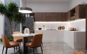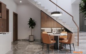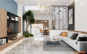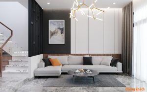 Nội thất căn nhà hiện đại 2 tầng hiện lên với đường nét đơn giản nhưng tinh tế qua các món đồ nội thất hiện đại cùng cách phối hợp màu sắc hài hòa. Cách phối trộn mảng màu đậm nhạt có phân vai chính phụ rõ ràng, kiểu dáng nội thất sang trọng kết hợp với sự hỗ trợ của đèn đã giúp không gian thêm ấn tượng.