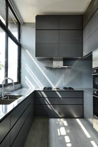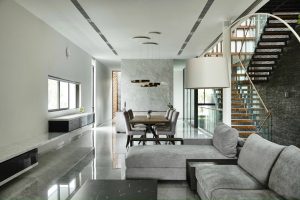 Viewing Back House và vẻ ngoài có phần kín đáo, mặt tiền được ốp đá granite và kính,nhưng không gian bên trong được thiết kế để căn nhà luôn đón sáng và thông gió quanh năm.