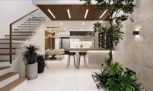 Mặt tiền ngôi nhà sẽ không đẹp nếu thiếu đi các vật liệu trang trí như kính, sắt, inox,… Cửa kính sẽ giúp tiết kiệm được không gian cho ngôi nhà. Đồng thời, nó còn làm cho ánh sáng tự nhiên đi vào căn phòng giúp chủ nhà có không khí tốt từ thiên nhiên hơn.