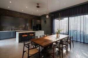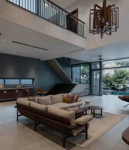 Công trình biệt thự hiện đại 2 tầng gây ấn tượng với không gian xanh và nội thất hiện đại như một kỳ nghỉ dưỡng thực thụ. Một không gian ấm cúng, gần gũi và đầy nắng ấm là những gì KTS muốn mang đến cho không gian khi sử dụng rất nhiều những ô cửa kính kích thước lớn cho công trình này.