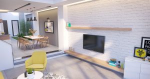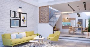 Nội thất hiện đại kết hợp với phong cách công nghiệp, những mảng tường gạch thô sơn trắng lạ mắt tạo nên những ấn tượng riêng cho căn nhà lệch tầng. Mặt dù phong cách này không quá mới lạ nhưng với sự hài hòa trong phối hợp nội thất đã khiến ngôi nhà khác biệt hơn. Thêm vào đó là những góc nhìn mới mẻ từ hệ cầu thang của nhà lệch tầng đã góp phần tạo nên những thành công cho căn nhà bị giới hạn diện tích.