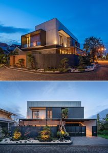 Ngôi nhà với hình dáng nằm trên một lô góc, với một khu vườn bao quanh góc. Mặt tiền của ngôi nhà sử dụng gỗ, ngói và thép và chịu ảnh hưởng của thiết kế nhà hiện đại Nhật Bản.
