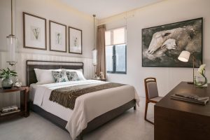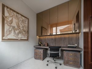 Nội thất được các Kiến trúc sư thiết kế tông màu ấm cúng, phòng khách được chú trọng với những mảng tranh nghệ thuật phần nào che đi phần cầu thang phía sau. Các tấm này cũng trở thành phông nền cho tivi. Sân có mái che một phần có sàn gỗ được trang bị bàn tròn và ghế ngoài trời. Lót tường bên trong của hàng rào là cảnh quan tương tự như bên ngoài của ngôi nhà.
