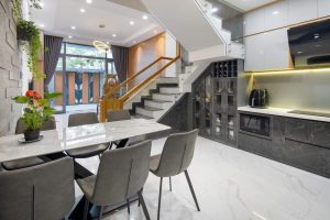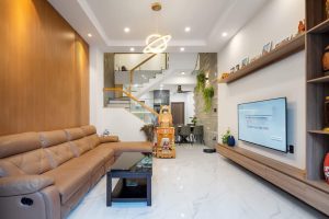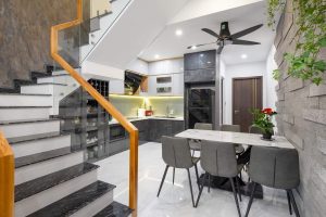 Nhà ống lệch tầng có thể hiểu đơn giản đó là những mẫu nhà có thiết kế cầu thang nằm lệch ở giữa các tầng với nhau, xung quanh là các phòng chức năng. Mặt sàn giữa các tầng sẽ không thẳng, vuông góc cố định mà có sự chênh lệch nhất định mang lại cảm giác rộng rãi, thoáng mát.