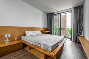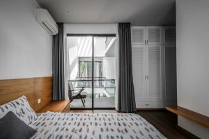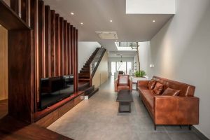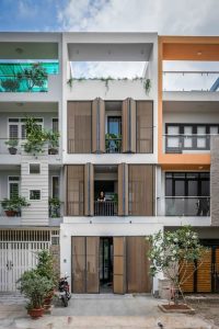Thiết kế nhà phố 4 tầng theo phong cách mặt tiền đơn giản, nhưng nổi bật lên là hệ thống cửa lam gỗ bao rộng cả 3 tầng. Phong cách thiết kế nội thất cũng khá đơn giản với trang trí lam gỗ, đồ dùng mang sắc gỗ ấm hiền hòa với sắc trắng của sơn tường. Đây là lối phối màu khá được ưa chuộng bởi vẻ đẹp đơn giản mà tinh tế.