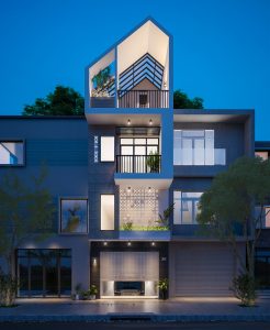 Tổng thể kiến trúc bên ngoài đưa đến người nhìn một vẻ đẹp hiện đại ấn tượng so với những kiến trúc ngôi nhà xung quanh khiến cho những ai đi trên cung đường này chắc hẳn phải dừng chân ngắm nghía. Màu trắng nhẹ nhàng làm chủ đạo trên toàn bộ không gian của ngôi nhà với thiết kế mặt phố phong cách hiện đại với những đường nét khỏe khoắn, sáng tạo với chất liệu kính, bê tông quen thuộc. Điểm nhấn là thiết kế hình mái chóp tăng cường sự thanh thoát cho toàn bộ kiến trúc.