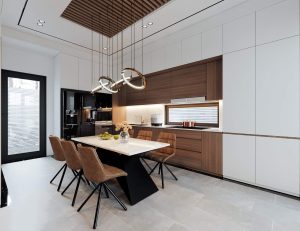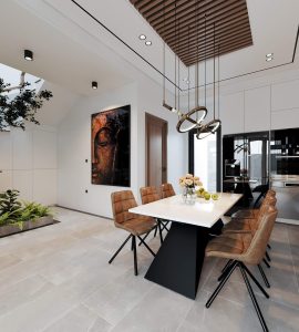 Nhà phố 3 tầng với phong cách kiến trúc, nội thất hiện đại được thiết kế với những đường nét, sắc sảo, bảng màu đơn giản và sử dụng các vật liệu có thể bao gồm kim loại, thủy tinh và thép. …tạo nên không gian sang trọng, không có nhiều chi tiết.