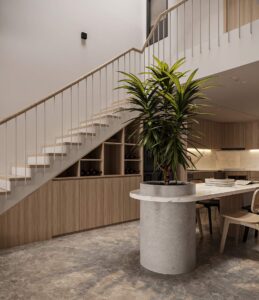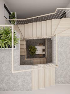 Ở công trình này, chúng tôi sử dụng phương án chia không gian thành tầng bậc khác nhau tạo ra một khu thông tầng lớn giữa nhà, qua đó giúp việc đối lưu không khí và thu hút ánh sáng.