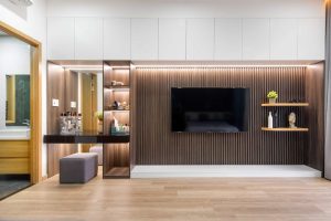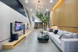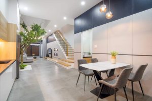 Với kích thước lô đất 5×20 rất khó để có thể sáng tạo các kiểu công năng cũng như bố trí không gian vừa thoáng khí vừa đầy đủ sáng. Tuy nhiên với bàn tay của Kiến trúc sư, bằng việc không bố trí phòng ngủ đã mang đến cho tầng 1 một không gian thông suốt từ phòng khách đến bếp và ra sân vườn. Ngoài ra, việc khéo léo bố trí ô thông tầng lớn giữa nhà, như một nơi giúp đối lưu khí và lấy sáng cho căn nhà. Chính những điều trên đã giúp ngôi nhà tuy là lô ống, với 2 nhà kẹp bên nhưng cực kỳ đầy đủ ánh sáng và gió, tạo cảm giác thoải mái gần gũi với thiên nhiên cho gia chủ.