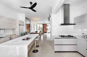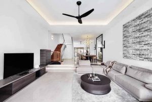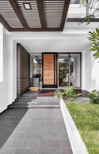 Mẫu nhà phố 3 tầng thiết kế theo phong cách hiện đại đơn giản nhưng tạo ấn tượng mạnh bởi sự đua ban công không cân xứng giữa các tầng, tạo sự gọn gàng cho ngôi nhà, kèm với thiết kế cửa kính rộng rãi như mở rộng không gian thêm cho thoáng mát. Lan can ban công kính cường lực cũng góp cho công trình thêm chắc chắn, hiện đại. Hơn nữa, thay vì các loại vật liệu truyền thống thì lan can kính điểm cho ngôi nhà tăng tính thẩm mỹ hơn rất nhiều.