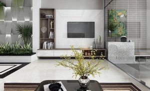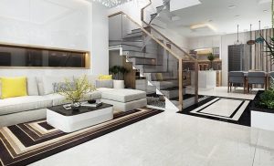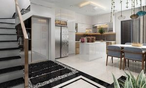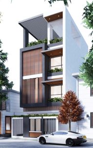 Nhà phố thiết kế theo phong cách hiện đại, sang trọng. Trước phòng khách là khoản sân đóng vai trò là gara đỗ ô tô và xe gắn máy của gia đình, tạo khoảng lùi hạn chế ảnh hưởng từ tiếng ồn đường phố. Cửa kính được sử dụng cho phép tầm nhìn xuyên suốt, loại bỏ cảm giác giới hạn không gian đồng thời cho phép ngôi nhà nhận được lượng sáng tự nhiên dồi dào, bầu không khí thêm phần thông thoáng.