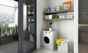 Không gian bếp được thiết kế ngăn nắp, vật dụng bếp được sắp xếp gọn gàng vào những ngăn/kệ tủ. Để tăng tính tiện lợi cũng như tạo thêm điểm nhấn cho gian bếp, một đảo bếp kích thước nhỏ gọn bố trí ngay ngắn, giảm sự trống trải đồng thời không làm cản trở di chuyển trong sinh hoạt.