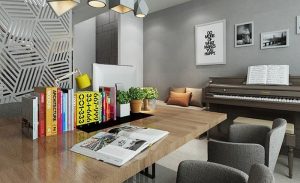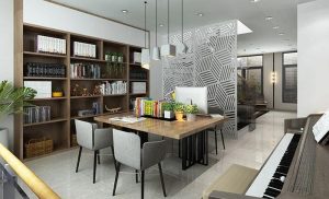 Hình thức cầu thang được ưa chuộng và phổ biến trong thiết kế nhà phố hiện đại bởi hiệu quả cao về mặt thẩm mỹ, cho phép tầm nhìn thông thoáng hạn chế sự bí bách dễ có trong không gian hạn hẹp của loại hình nhà ống – nhà lô phố. Gầm cầu thang được tận dụng bố trí kệ sách với phần sàn được trải đá kèm tiểu cảnh đối diện tạo cảm giác hết sức mộc mạc, gần gũi thiên nhiên ngay trong không gian sống giữa một đô thị nhộn nhịp.