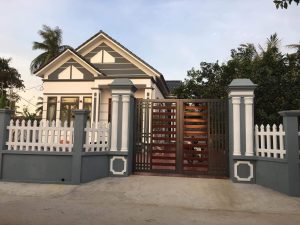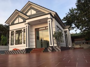 Phần mái thái nổi bật góp phần tạo sự ấn tượng cho mẫu thiết kế này. Kết hợp sơn tường trắng trung tính cùng những mảng màu xám ghi vừa đối lập lại vừa làm nổi bật lẫn nhau. Kết hợp cùng gạch ốp chân tường sang trọng như tôn lên nét kiến trúc khỏe khoắn của ngôi nhà.